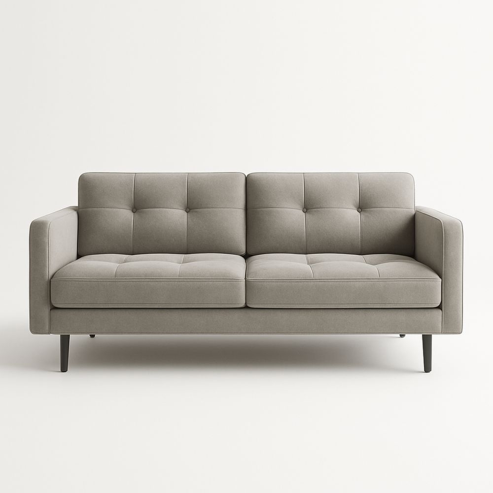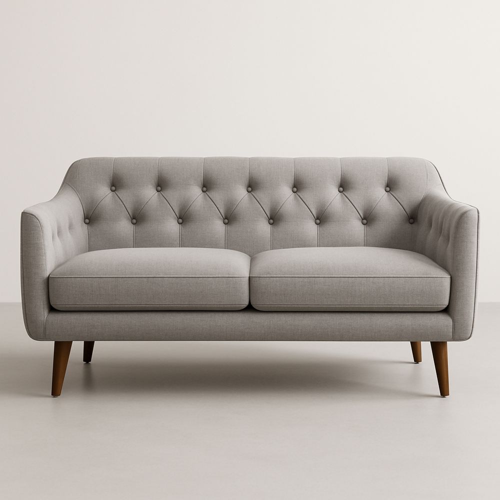 Divano a due posti in tessuto grigio con gambe in legno