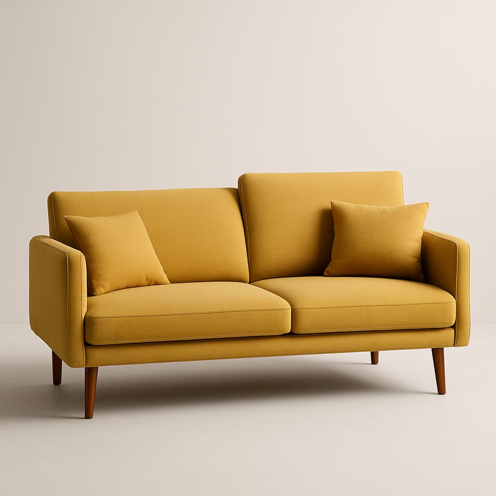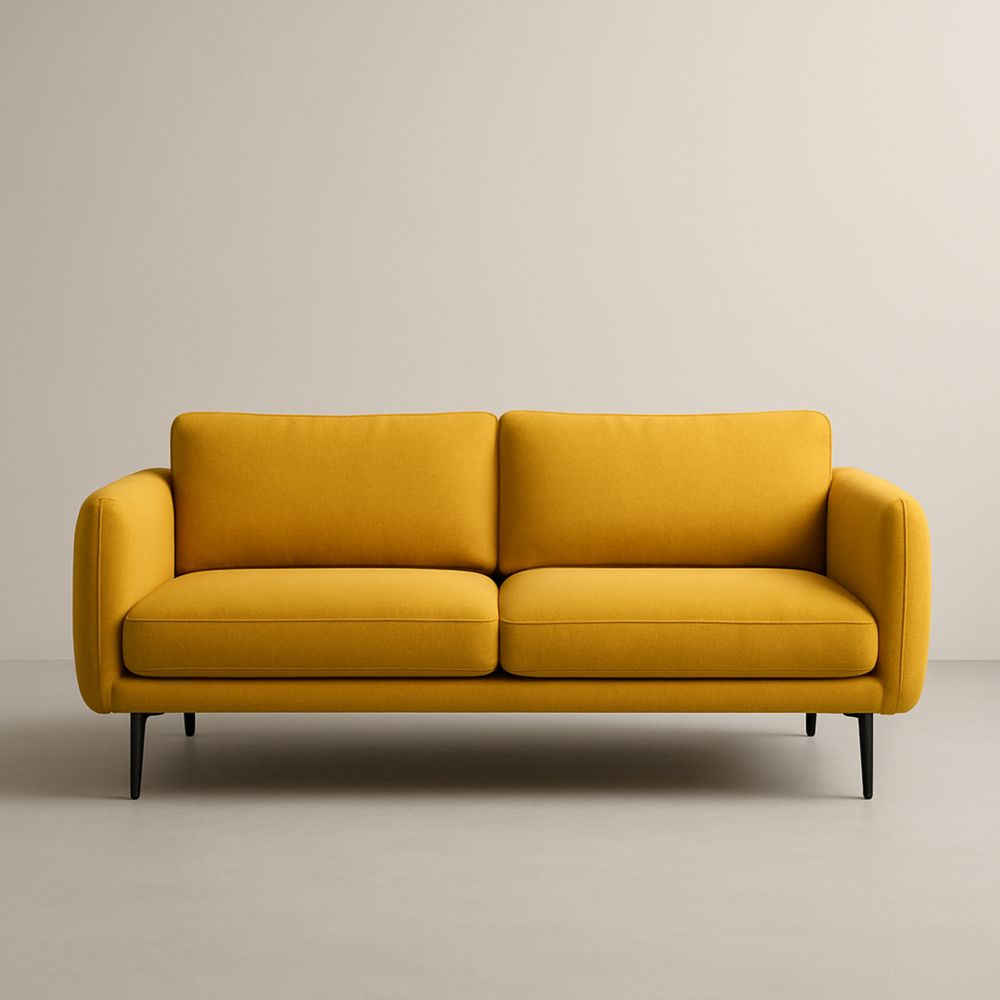 Divano a due posti in tessuto giallo con gambe in metallo